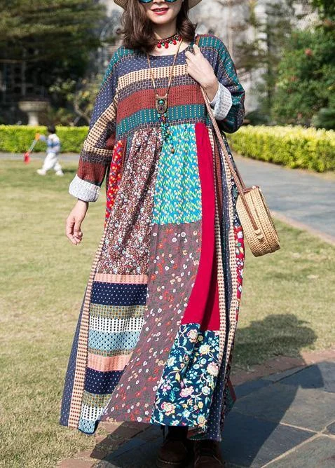 100% multicolor cotton clothes For Women patchwork o neck Plus Size Clothing spring Dress