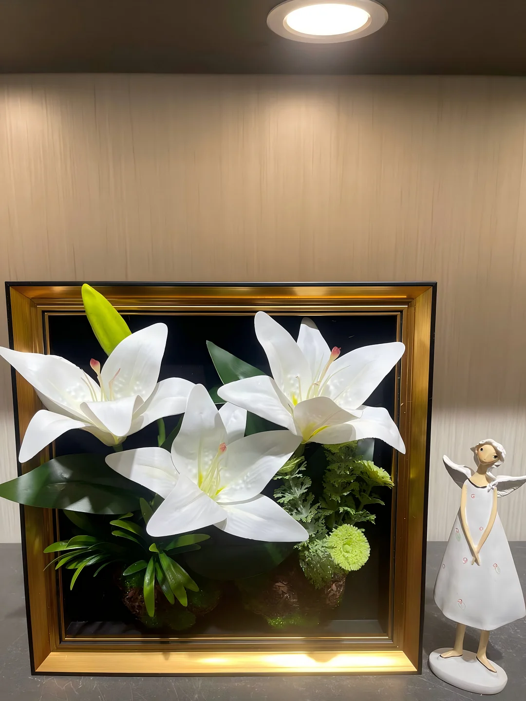 This artificial white lily framed floral arrangement showcases beautifully detailed lily blooms paired with lush green foliage for a striking three-dimensional effect. The graceful white petals symbolize purity and sophistication, making this piece a refined accent for any interior.