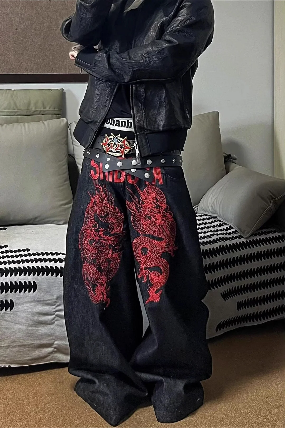 Baggy Gothic Streetwear Plaid Patch Denim Floor-Length Pants