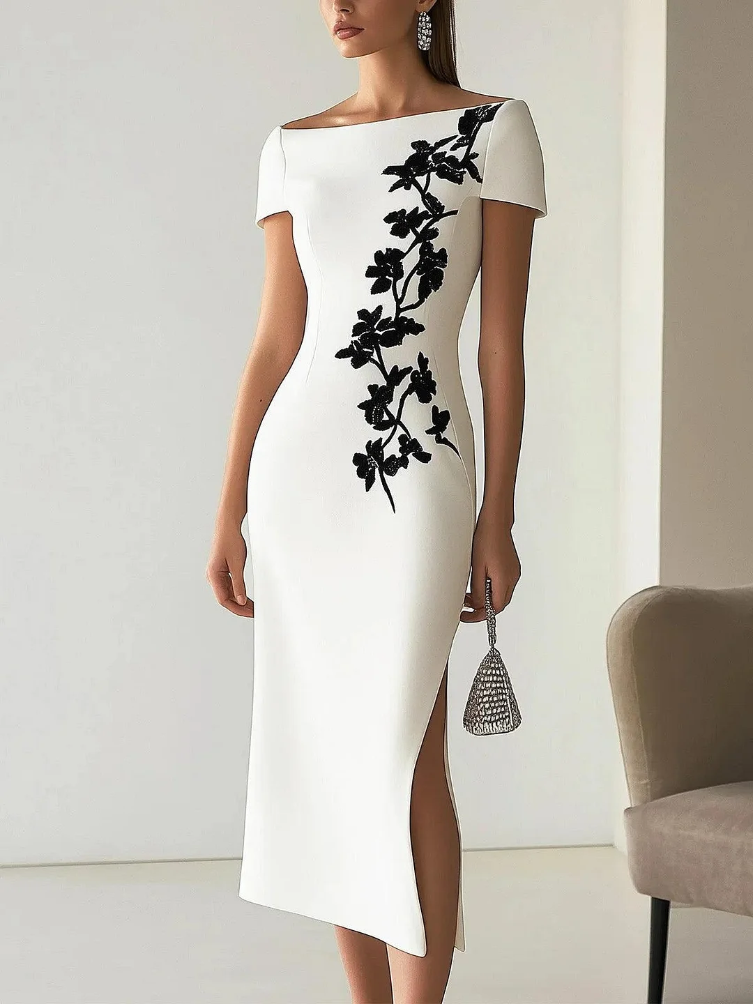 • Design: Features a sophisticated boat neckline and a striking asymmetrical floral print that draws the eye, giving the dress a modern yet artistic flair