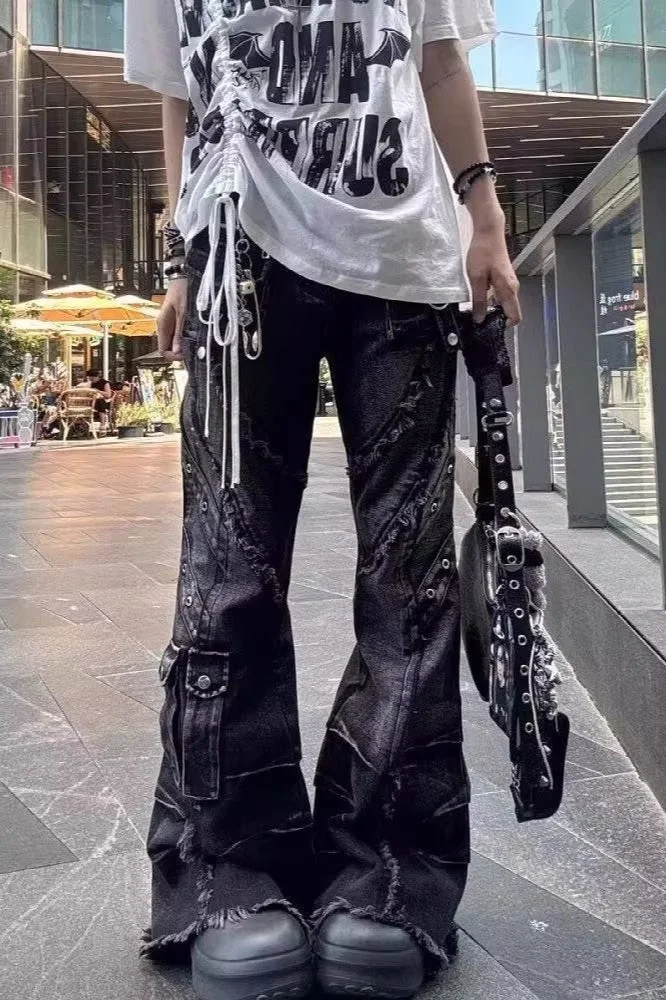 Edgy Y2K Oversized Raw Hem Flare Denim Pants