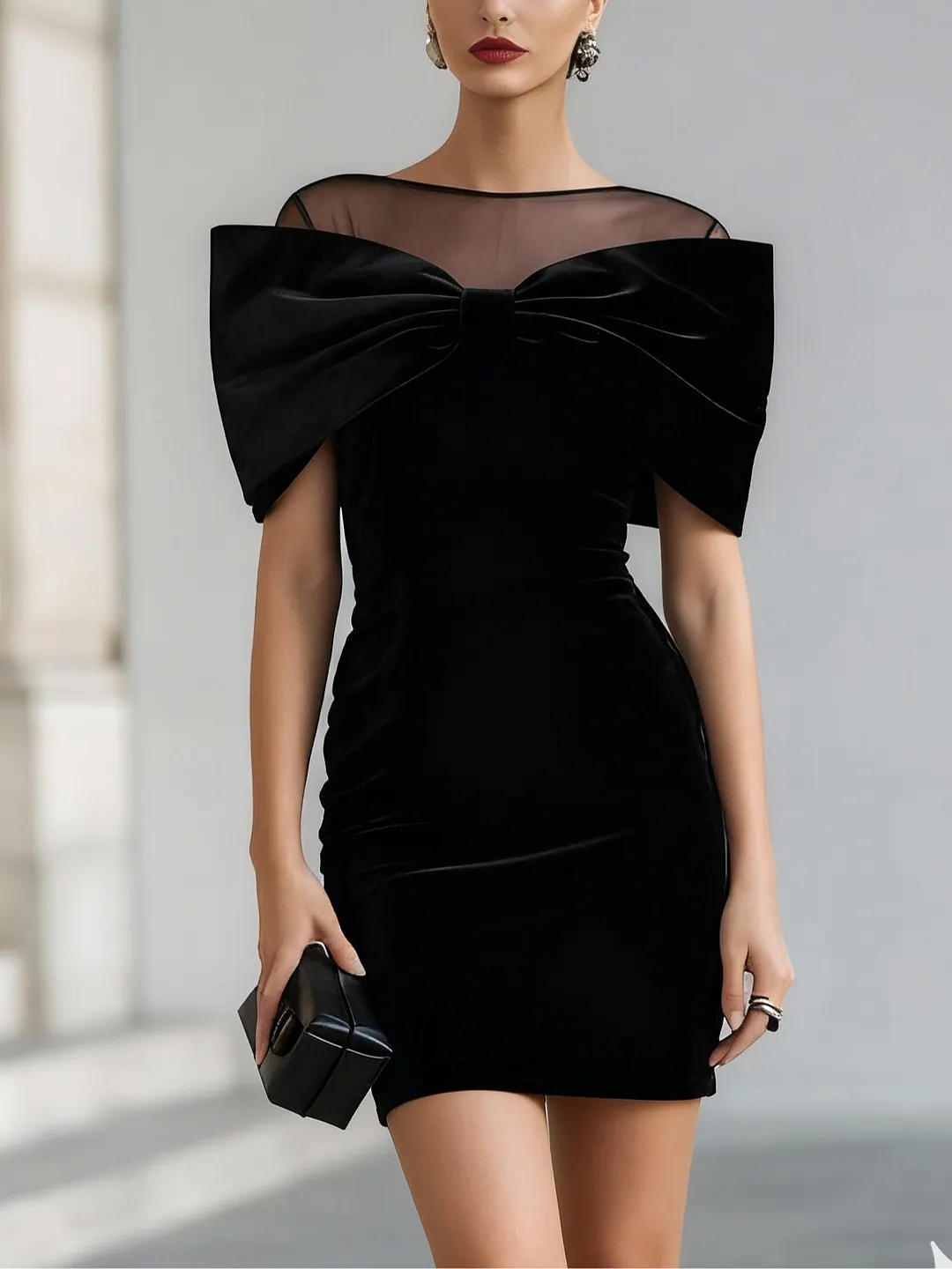 Design: Sheer mesh boat neck, oversized velvet bow at the chest