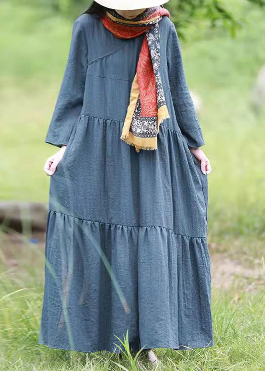 French Blue V Neck Ruffles Patchwork Holiday Dress Long Sleeve