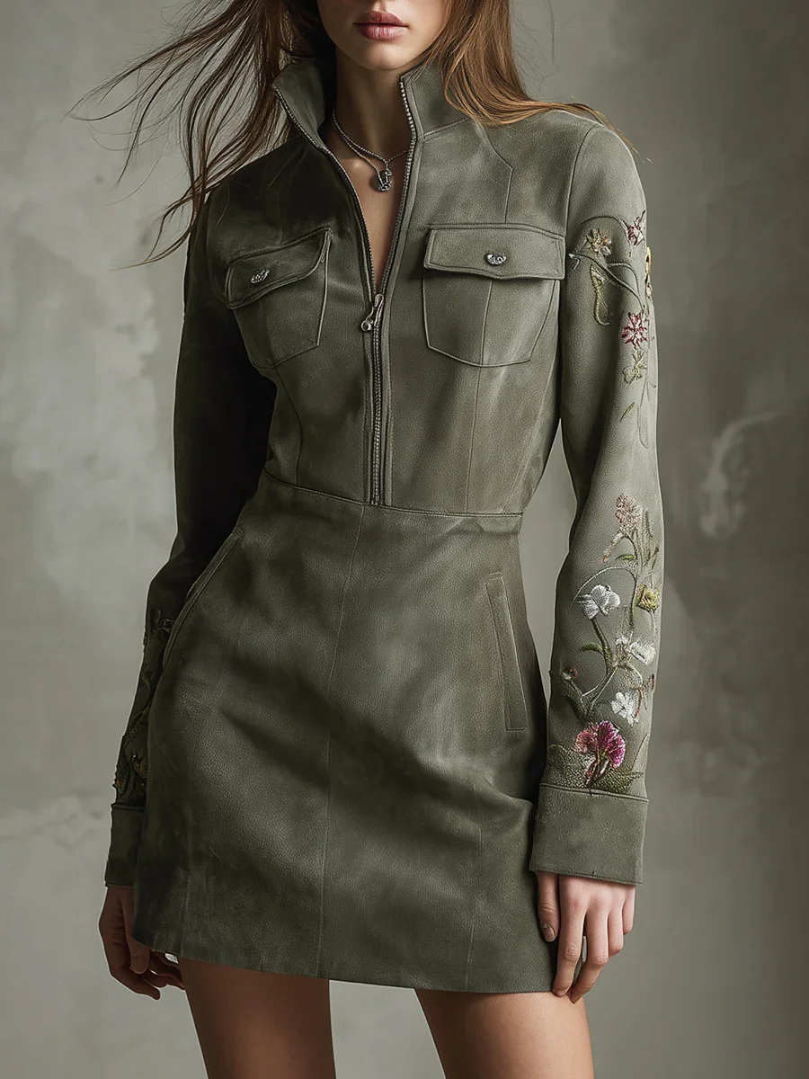Green Embroidered Faux Suede Half-zip Mini Dress