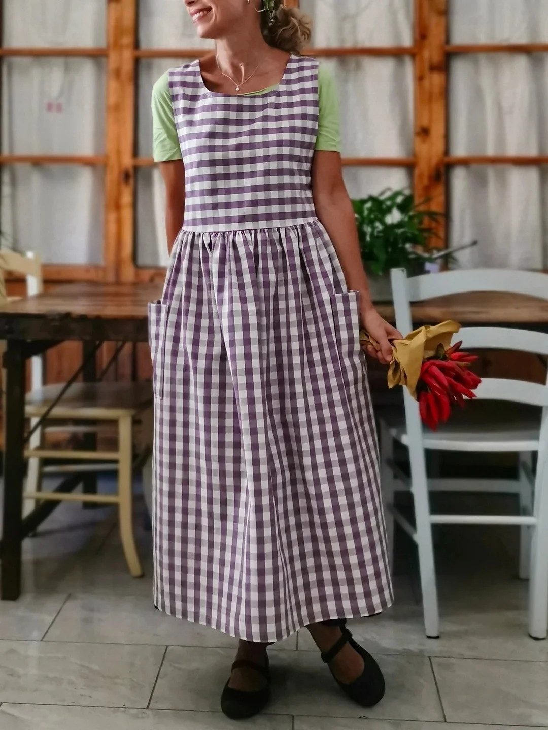 This apron is made of a beautiful cotton fabric in purple and cream checkered pattern, colorful and suitable for everyone.