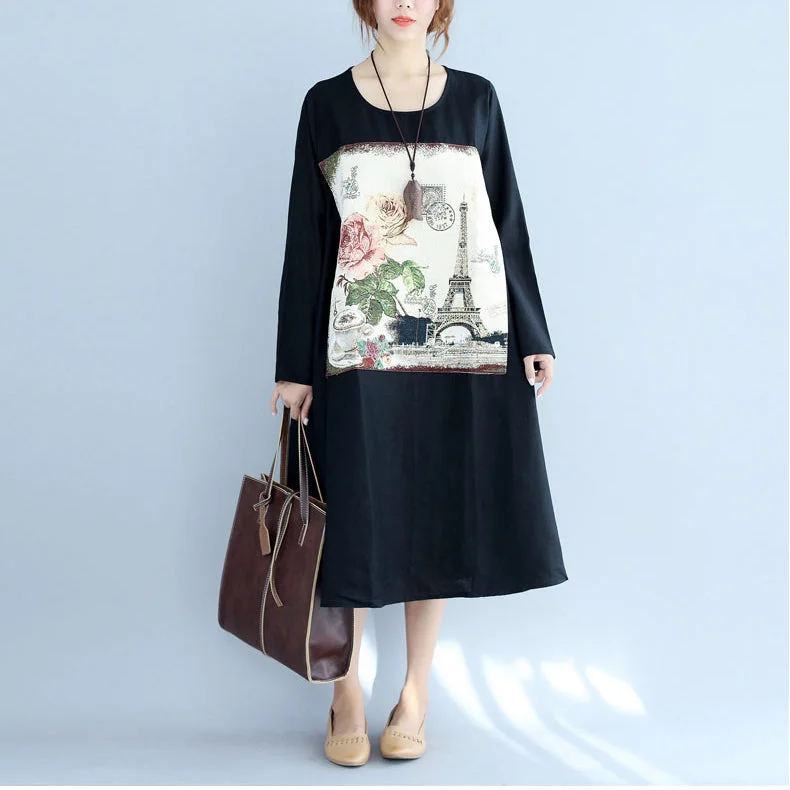 new black print cotton linen dresses plus size long sleeve maternity dress
