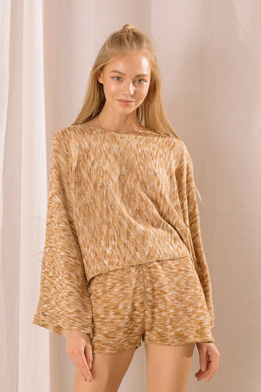 This sweater features an off-the-shoulder look and wide bell sleeves for a cozy look. With a cropped and loose fit, this sweater is the perfect way to look chic and snug.