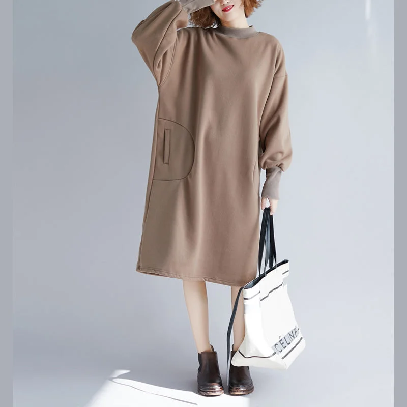 stylish khaki spring cotton dress Omychic warm long sleeve thick holiday dresses o neck cotton clothing dresses