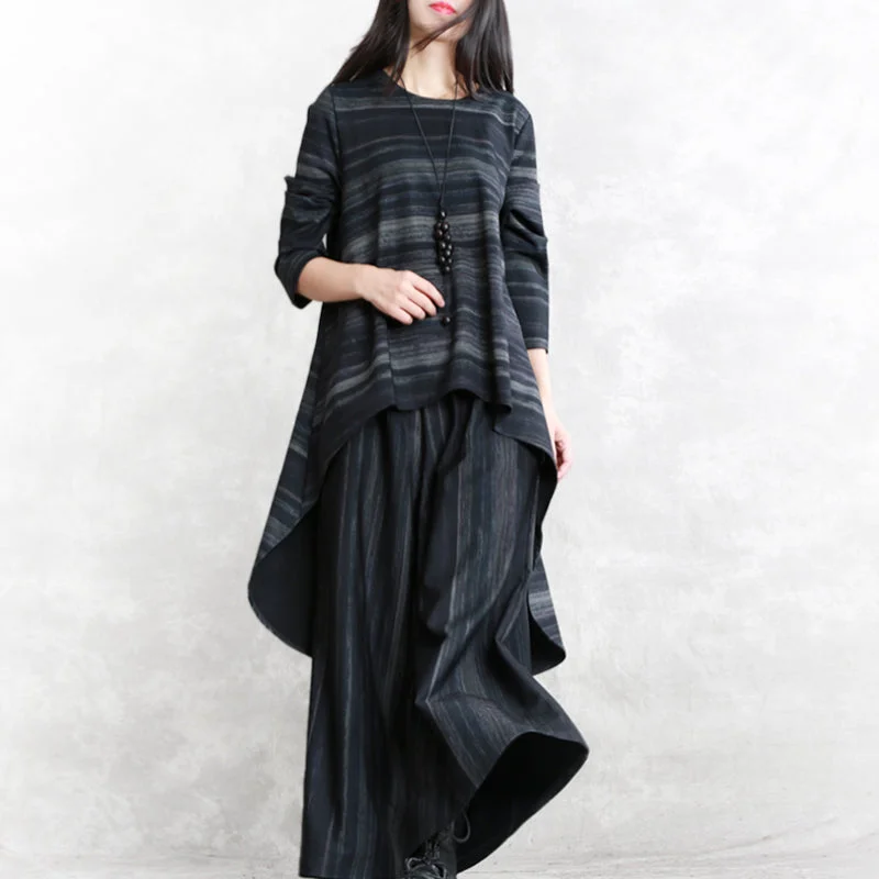 fine black striped pure cotton blended two pieces plus size traveling clothing boutique long sleeve o neck pockets tops cotton blended baggy trouse
