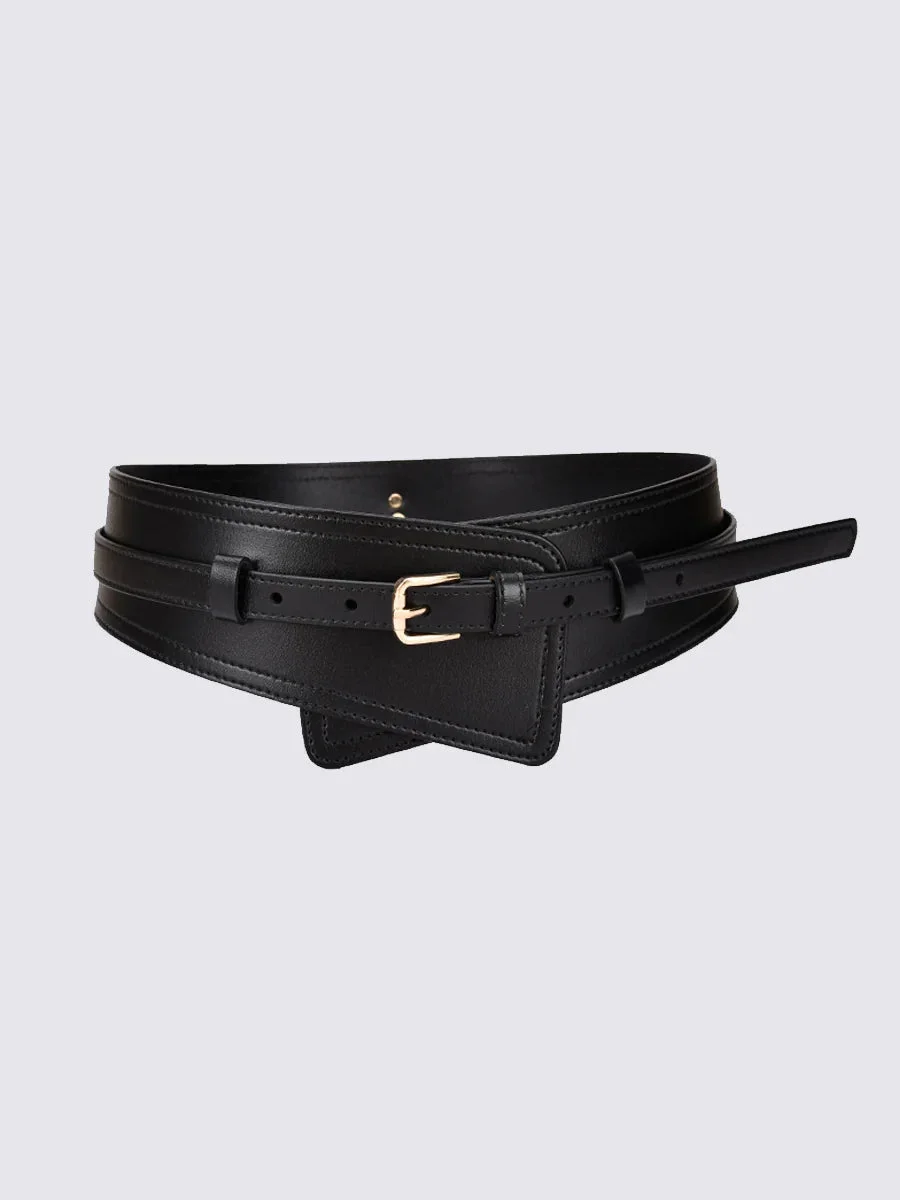 This wide belt features imitation leather with a harness-style design, adding a bold and trendy statement to your outfit.